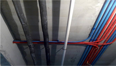 所有管線整齊排列在天花上,用專用管碼吊在天花上,所有墻面線管豎直向下