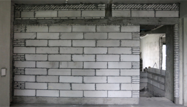 新砌墻體底部全部加水泥砂漿地梁,砌到門頭梁位置時加一道鋼筋混凝 土梁,頂部用小沙磚斜砌,批蕩時雙面加鋼網(wǎng)。