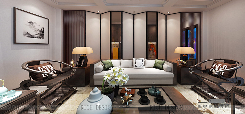 別墅裝飾在新中式設(shè)計(jì)上延續(xù)了明清時(shí)期家居配飾理念,提煉了其中經(jīng)典元素并加以簡化和豐富,在家具形態(tài)上更加簡潔清秀,空間配色也更為清新自然。