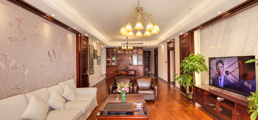 本案現(xiàn)代水灣1979別墅裝飾采用實(shí)木材質(zhì)作為主基調(diào),使整個(gè)空間看起來(lái)“溫馨”與“典雅”。家具選擇則沿襲了線條古典大氣的風(fēng)格,合理融入整個(gè)空間。營(yíng)造溫馨和諧的高端生活品質(zhì)。