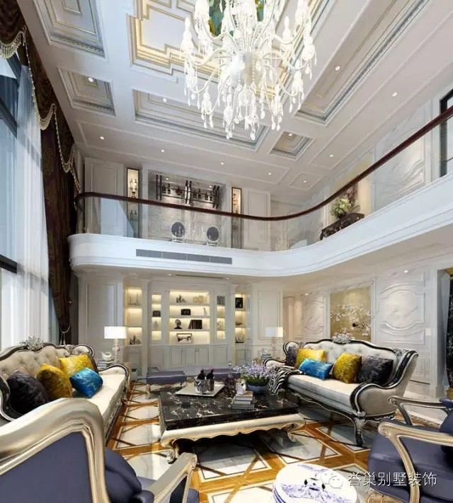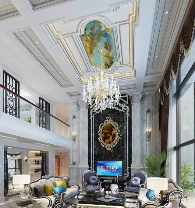 客廳的形式上以浪漫主義為基礎(chǔ),大理石瓷磚、多彩的織物、色彩鮮艷的沙發(fā),精致的法國壁掛,華麗的枝形吊燈營造氣氛整個(gè)風(fēng)格豪華、富麗,充滿強(qiáng)烈的動(dòng)感效果。