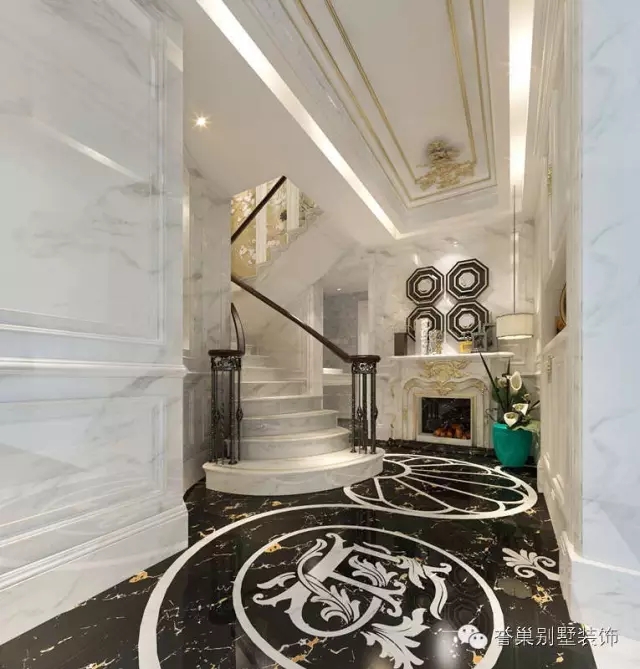 玄關(guān)的位置,地坪大理石以水刀切割,非常富貴大器,而深色主題從玄關(guān)即開始發(fā)展。